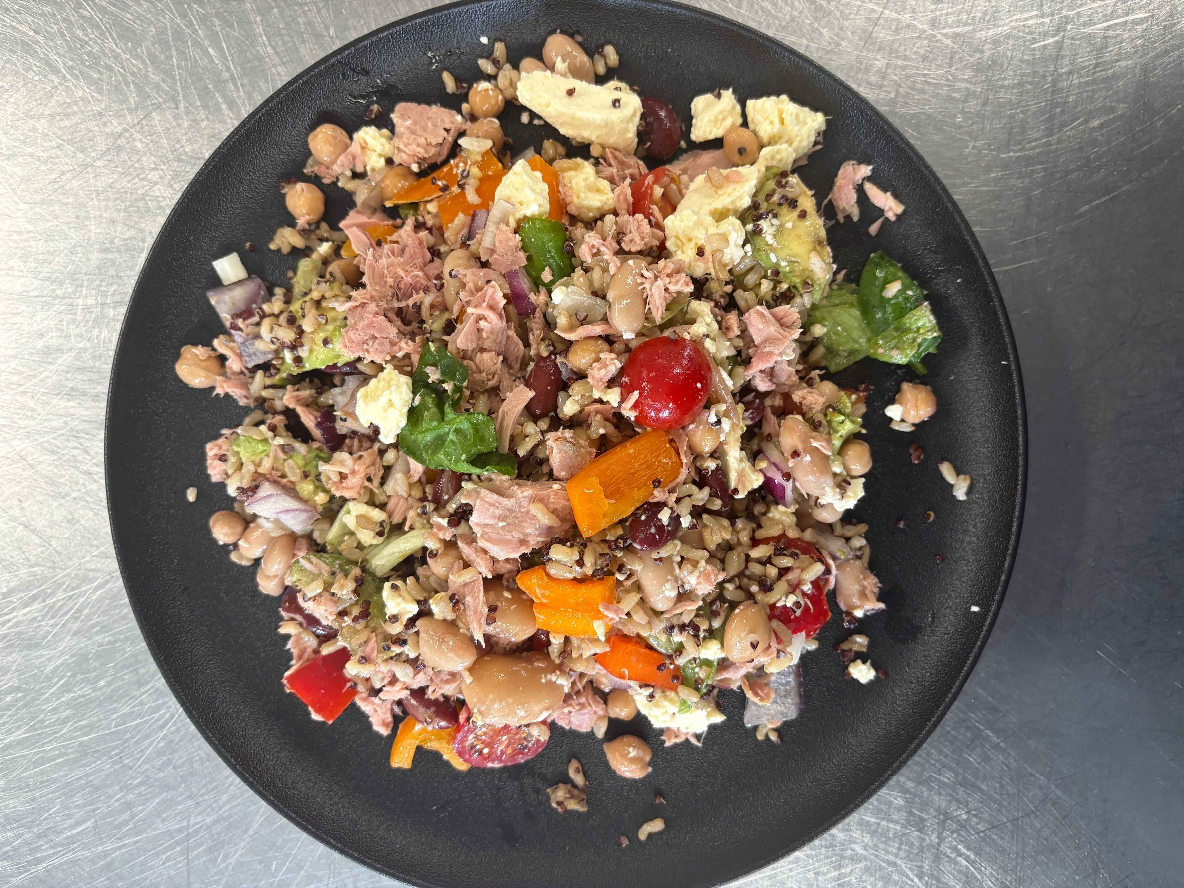 Prepare rice according to directions. Combine all the ingredients in a bowl and serve. You can add a splash of olive oil if desired. Storage - Keep in covered in the fridge for up to three days